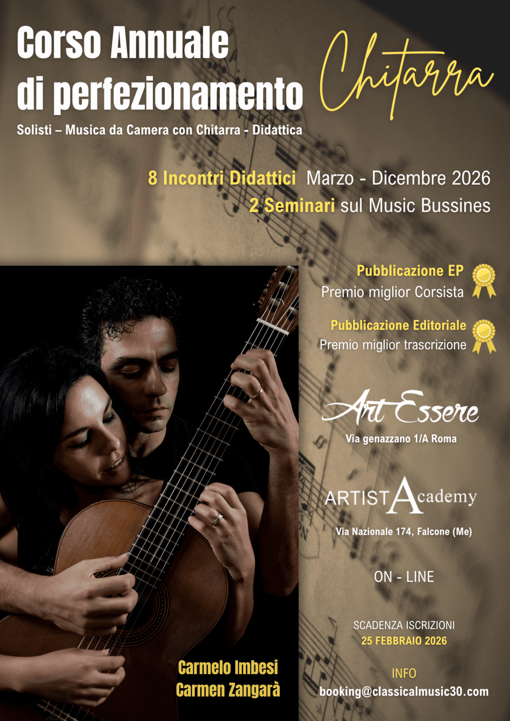 «Acclaimed by the public and critics for their brilliant technique, passion, quality of sound and elegance, Carmelo Imbesi and Carmen Zangara, a cople in art and in life, are one of the most interesting and appreciated Chamber Guitar Duos.». October 2019 | M.Today